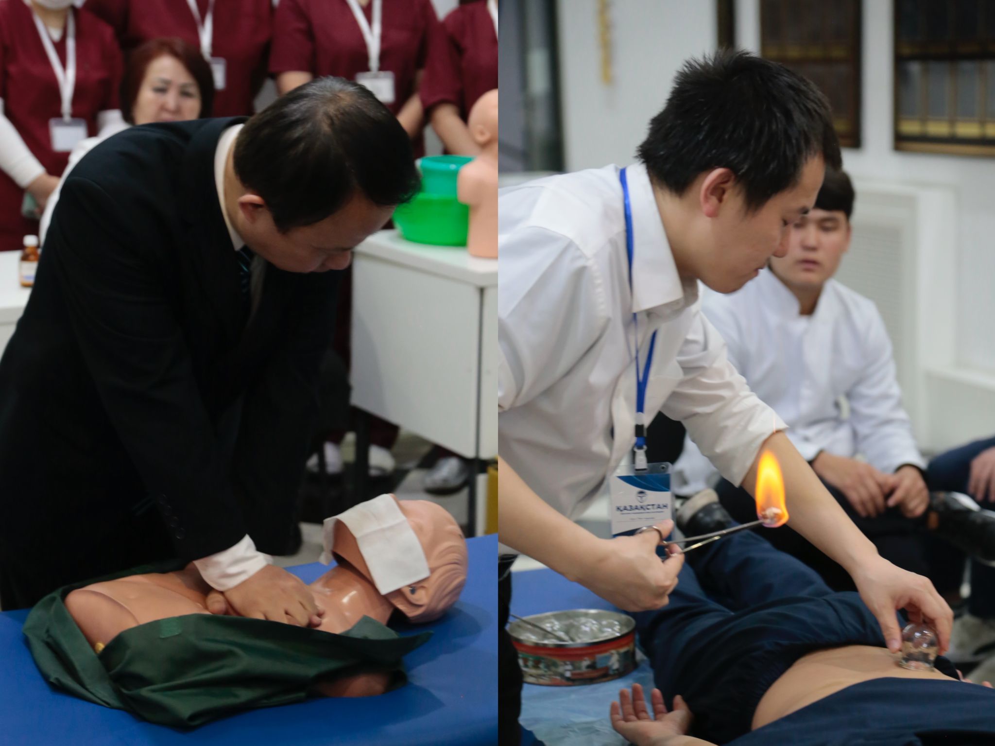 宋鹏、张英杰两位老师结合哈方医疗需求与当地疾病特点,精心设计交流内容。在急救培训环节,通过理论授课、实操演示、分组演练相结合的方式,系统讲解心肺复苏、外伤止血包扎、应急处置流程等实用技能,手把手指导当地师生掌握关键操作要点,提升应急救治能力。中医知识普及中,聚焦中医针灸、推拿、拔罐等适宜技术,结合哈萨克斯坦民众常见的寒湿病、颈肩腰腿痛等病症,通过案例解析、现场体验、双语答疑等形式,生动阐释中医“治未病”理念与诊疗逻辑,让当地师生直观感受中医药的独特魅力。在国际合作研讨会上,两位老师分别作了学术报告,获主办方致信感谢。