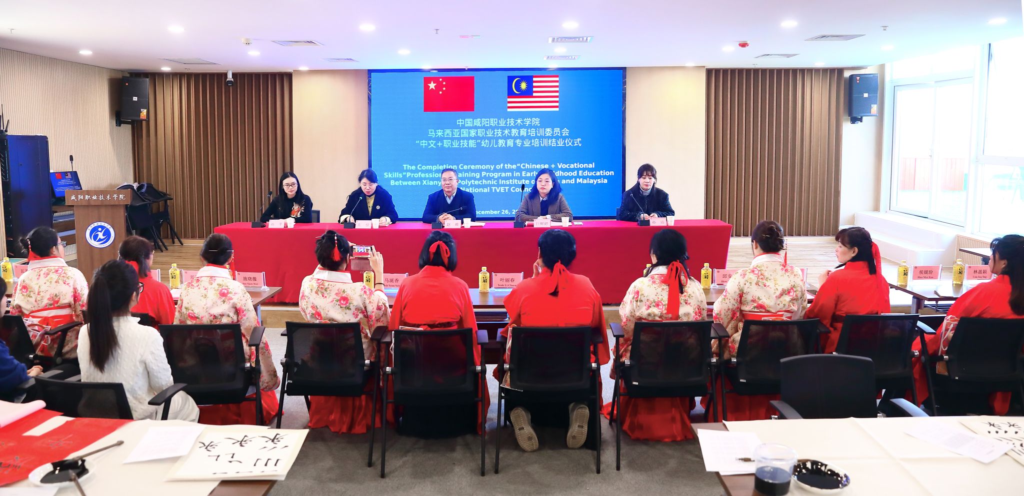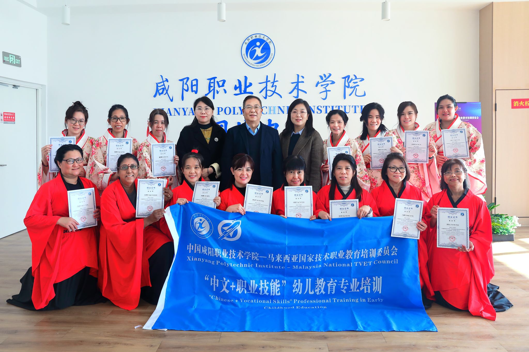 12月28日,由马来西亚国家职业技术教育培训委员会组织的16人培训团到咸阳职院,参加为期八天的“中文+职业技能”幼儿教育专业培训项目圆满结业。咸阳职院党委副书记赵维,师范学院、国际交流合作处负责人,课程管理组人员及16名马来西亚培训团学员参加结业仪式。